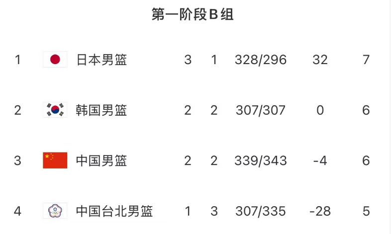 中国男篮先后逆转日本队和中国台北队,拿到4分的积分;加上开局阶段被韩国队双杀,拿到2分,中国男篮4场比赛的最终积分为6分。韩国队同样为6分。
